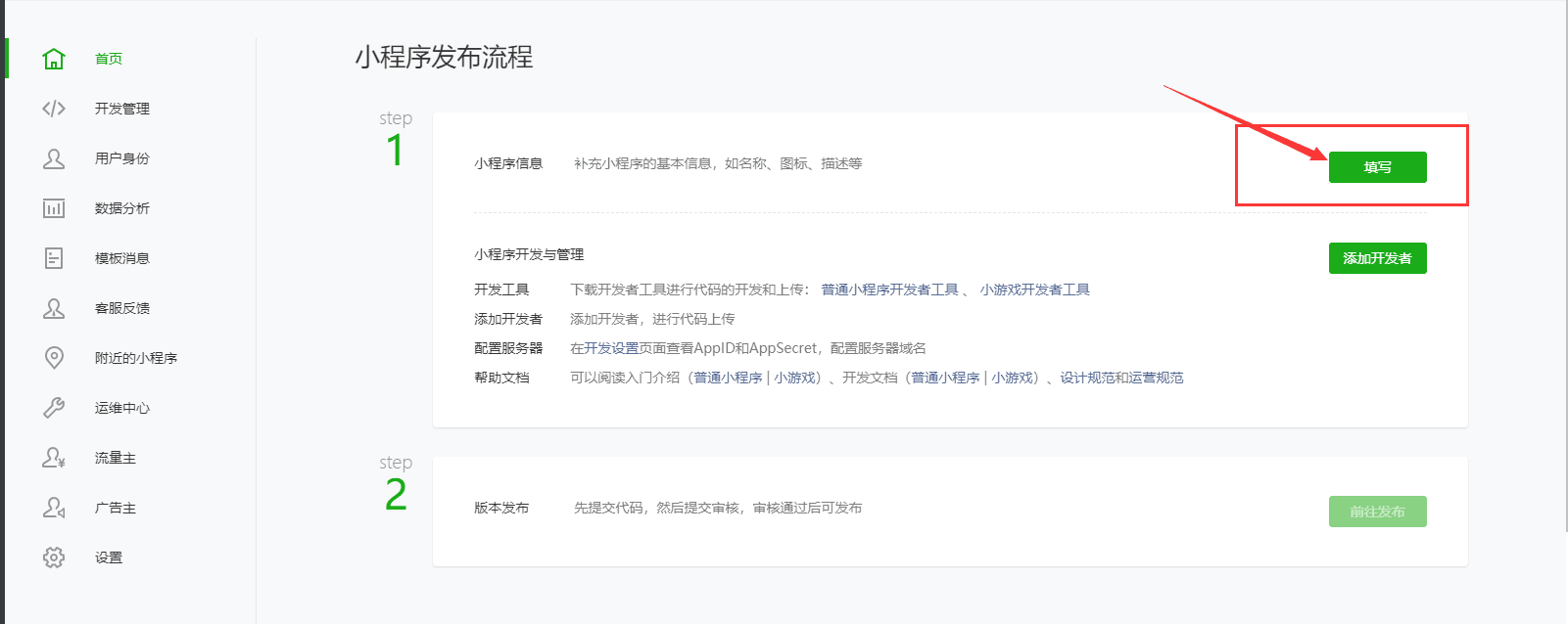 认证成功后,您可以前往微信公众平台填写小程序相关信息。点击小程序信息右侧的填写按钮。
