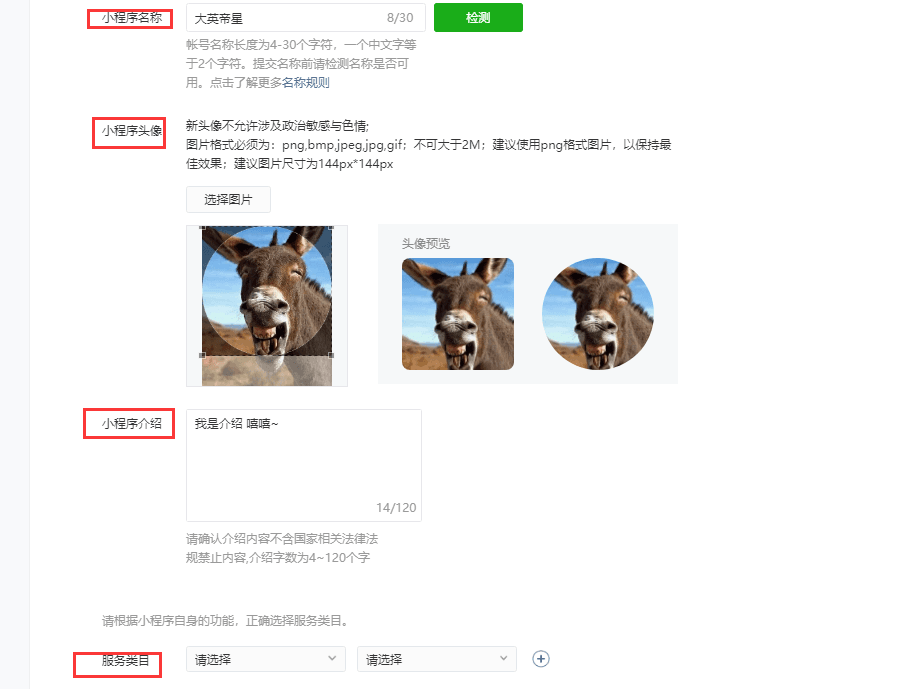 请依次填写小程序名称、头像、介绍和服务类目。