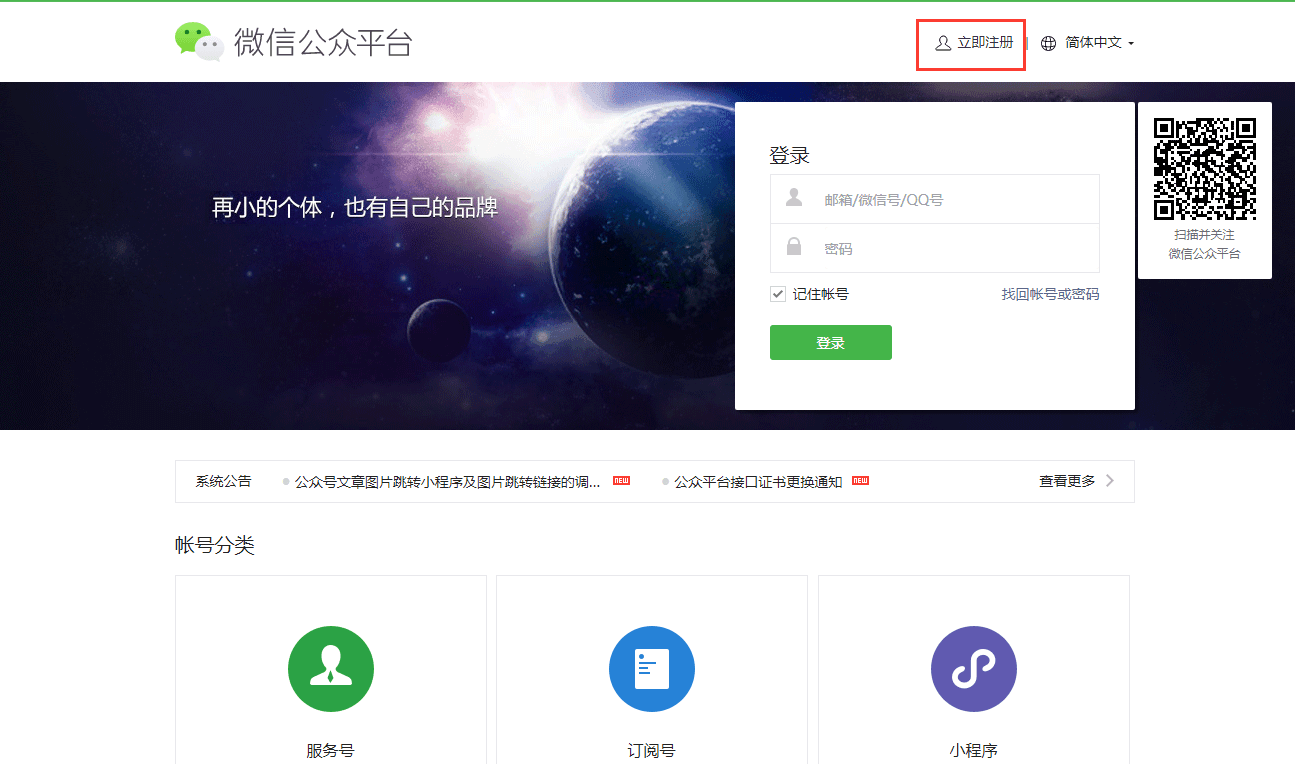 打开微信公众平台: https://mp.weixin.qq.com/ , 点击右上角的立即注册按钮。