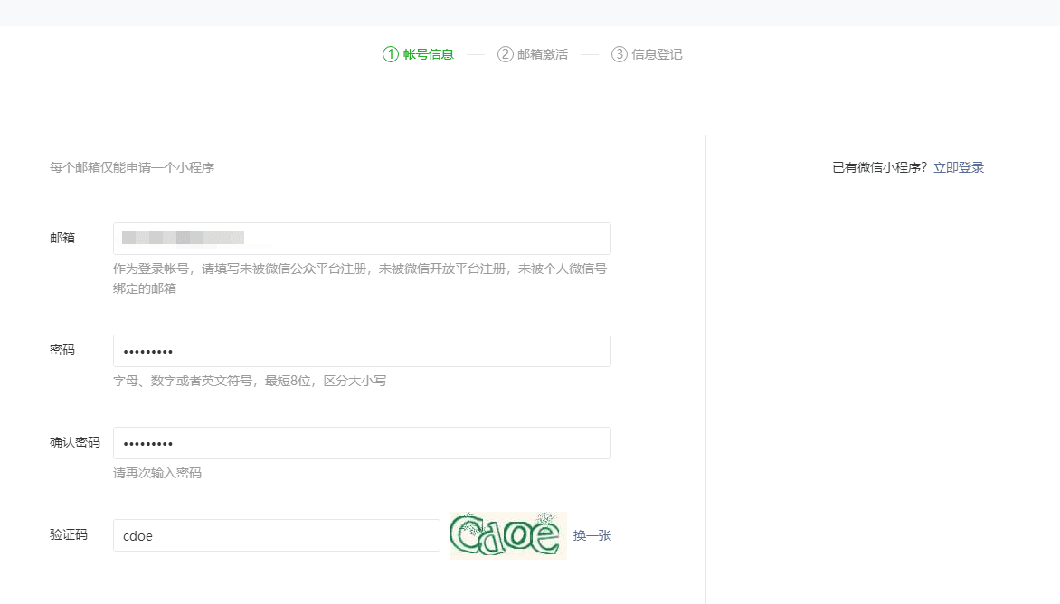 依次填写邮箱、密码、验证码等信息进行注册。
