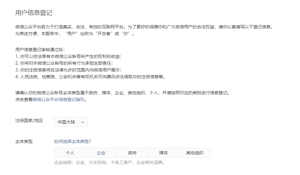主体类型说明(图片来自于微信) 注意:若您需要开通微信支付,小程序主体不得为个人,微信规定主体为个人的小程序无法开通微信支付。